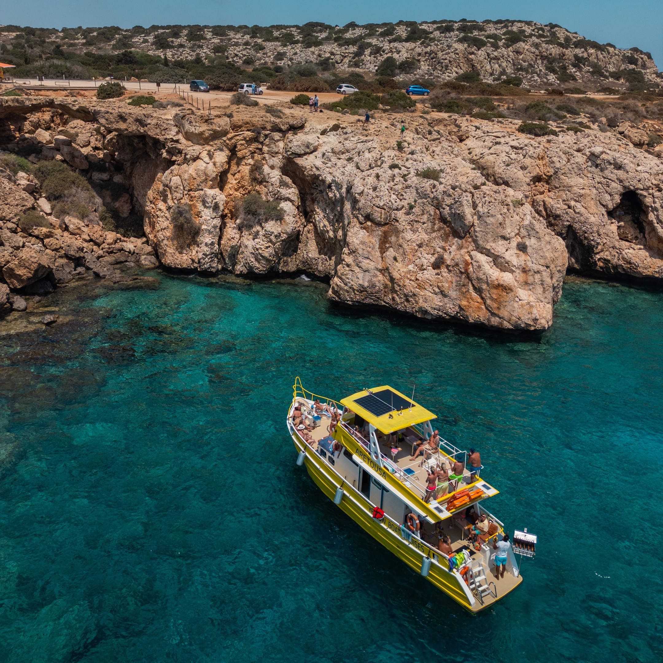 Itinerary: Ghost Town Famagusta View, Central Protaras, Green Bay, Turtle Bay, Cape Greko, Sea Caves, Blue Lagoon & Swim Stops